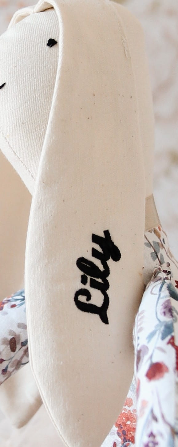 Dodatkową cechą naszego króliczka jest PERSONALIZACJA czyli starannie wyszyte imię Twojego dziecka, na życzenie klienta wyszywamy również datę urodzenia. Jeżeli chcesz skorzystać z tej możliwości wybierz opcję ''personalizacja''.
